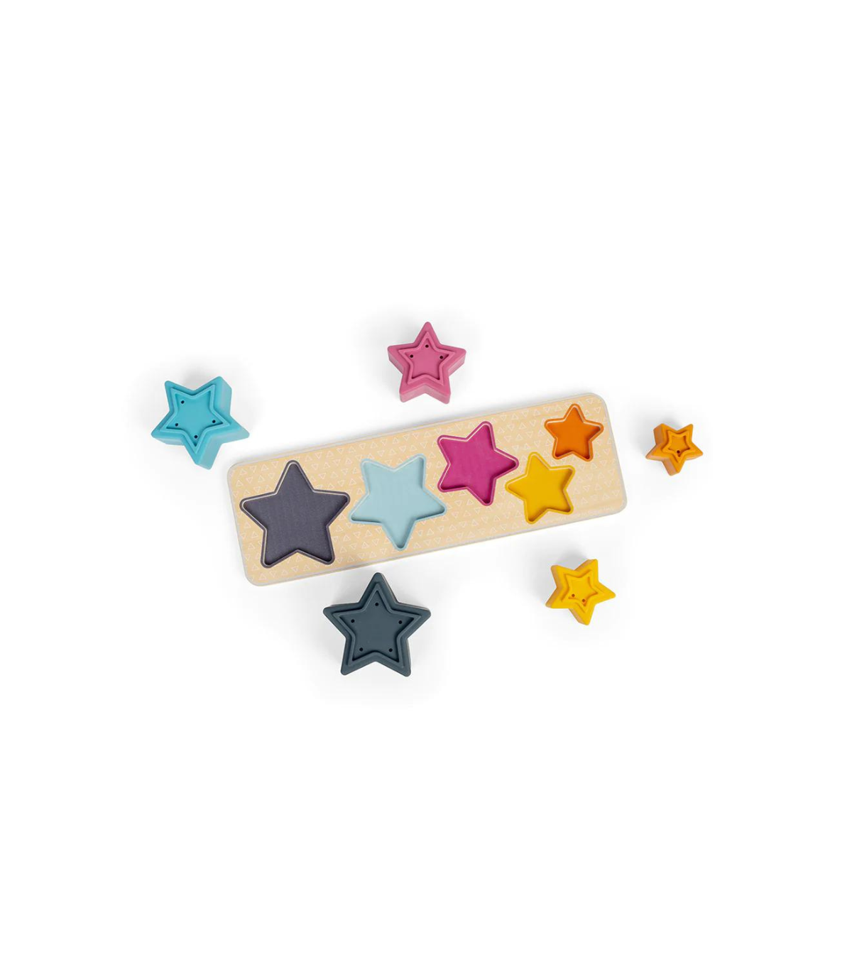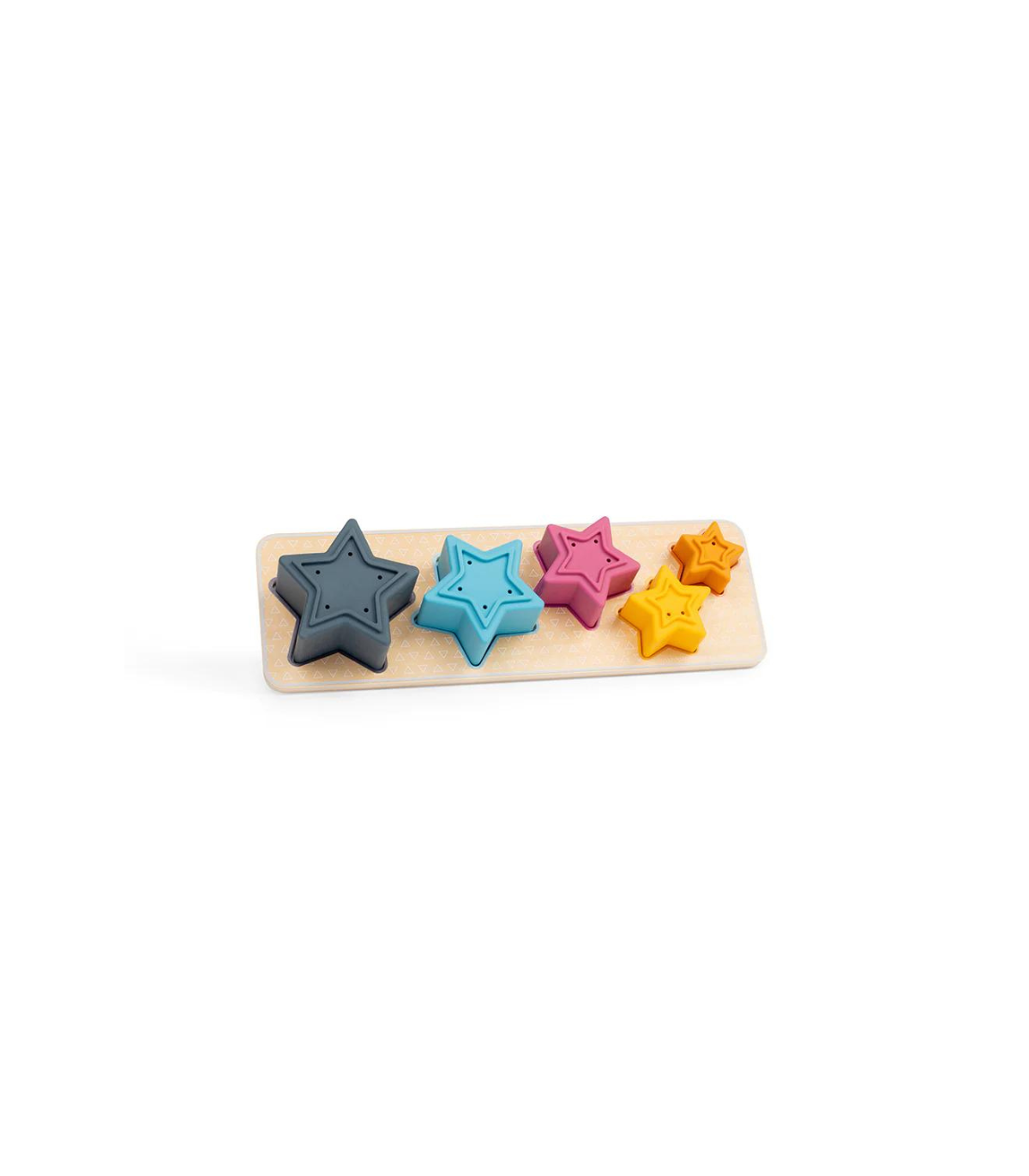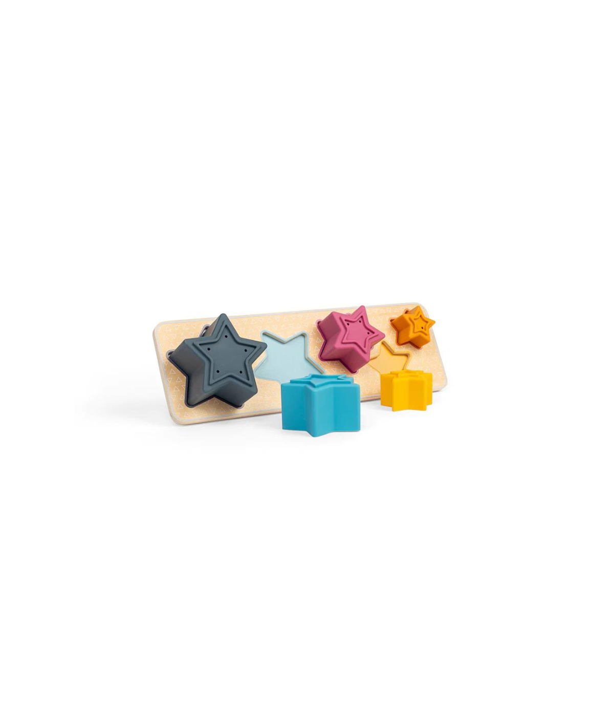 This shape sorter toy consists of five silicone stars and a wooden sorting board. Children learn to recognize size and color by placing the stars in the correct boxes on the sorting board. The stars can also be used as stacking toys and are perfect for bath time.