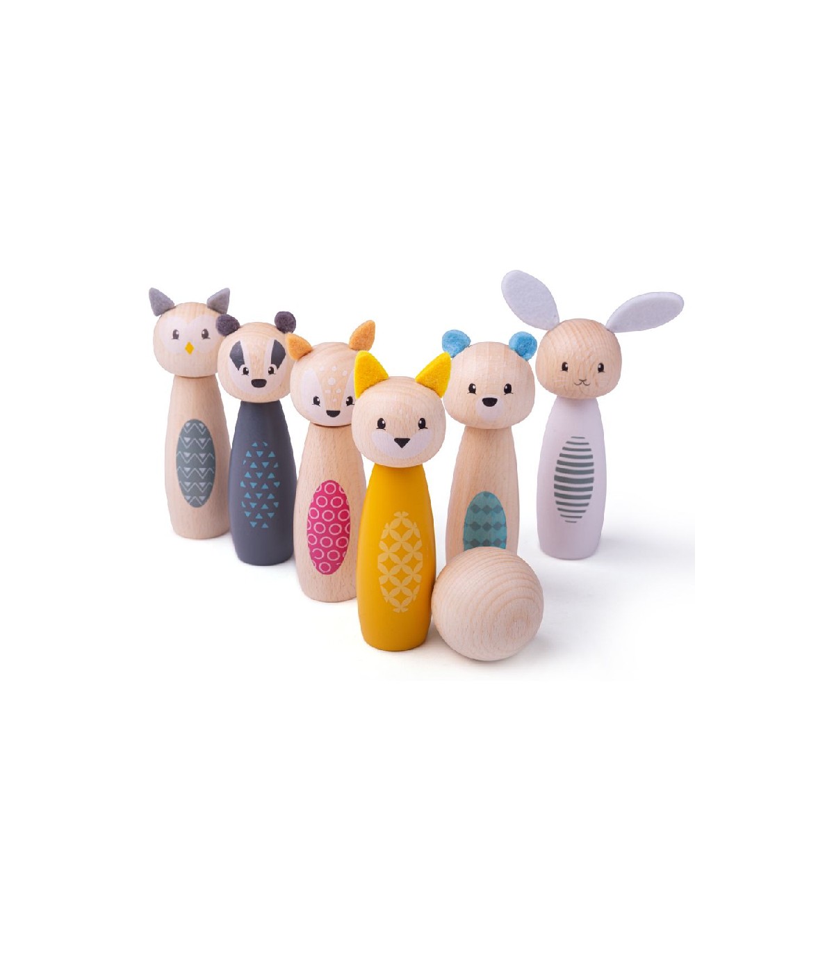 Wooden skittles game with animal figures. Knock over the figures with the wooden ball, over and over again. Suitable for children ages 2 and up.