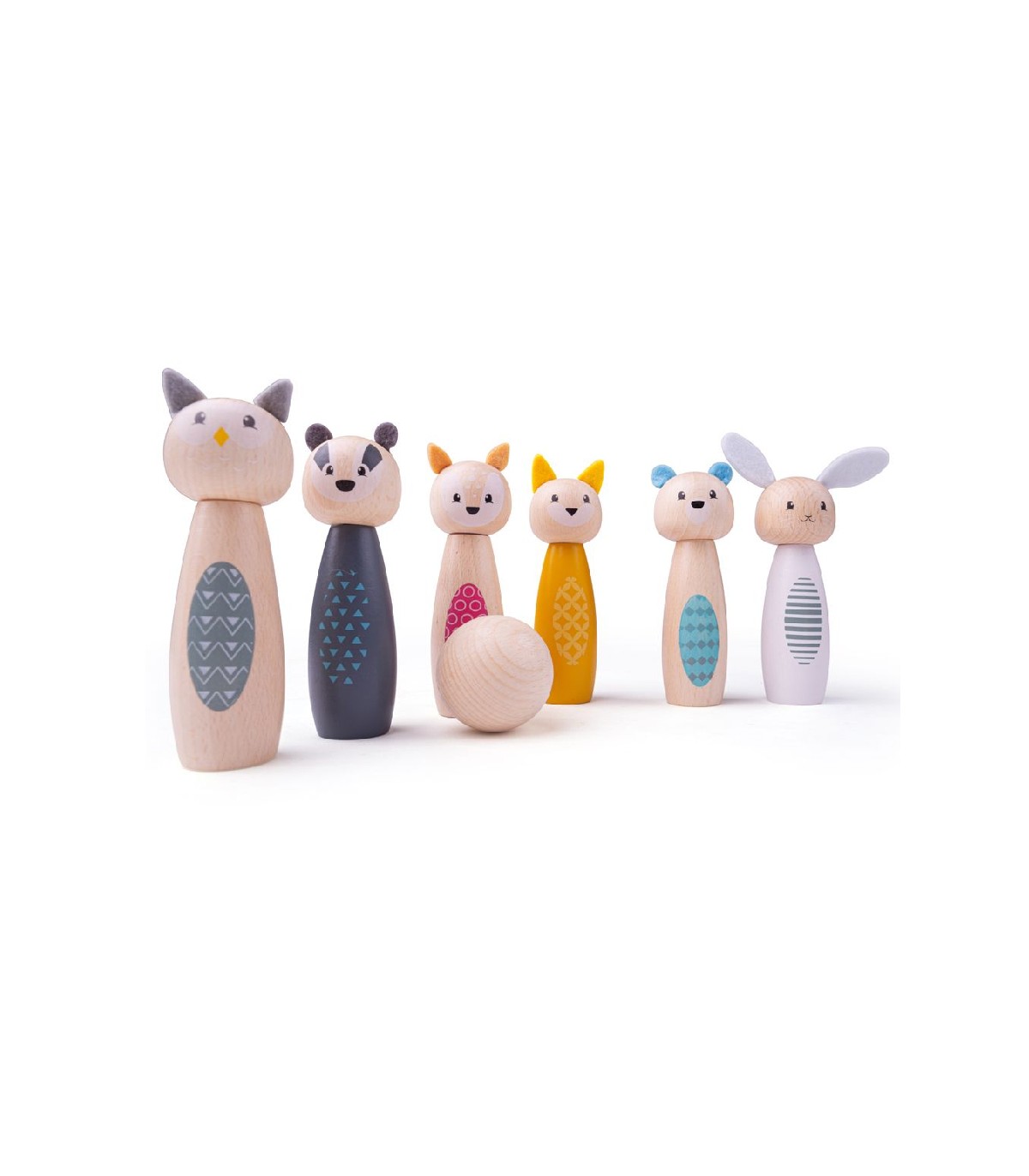 This wooden skittles set includes six skittles with different animal figures, a ball, and a storage bag. The playset challenges children's hand-eye coordination and helps them become more agile.