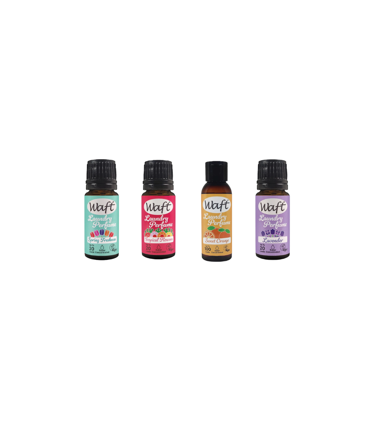 Imagine opening your closet and being greeted by the scent of exotic flowers, a soothing lavender field, a sunny orange grove, or a fresh spring breeze. With Waft's concentrated laundry fragrances, every wash becomes a fragrant experience.