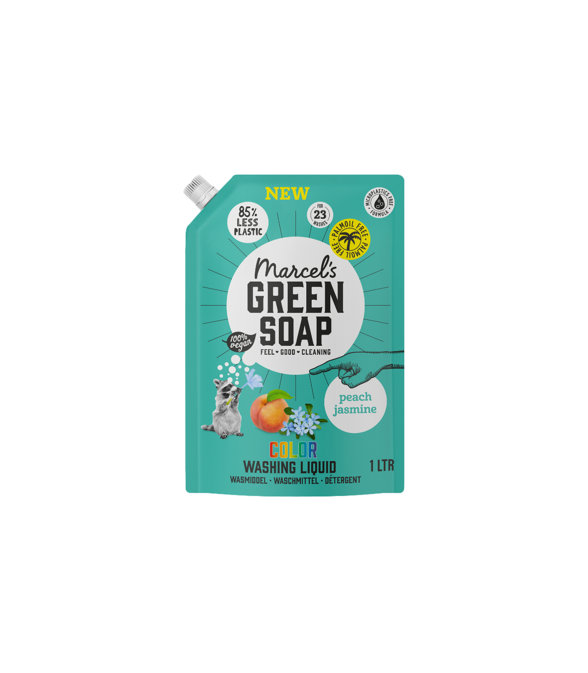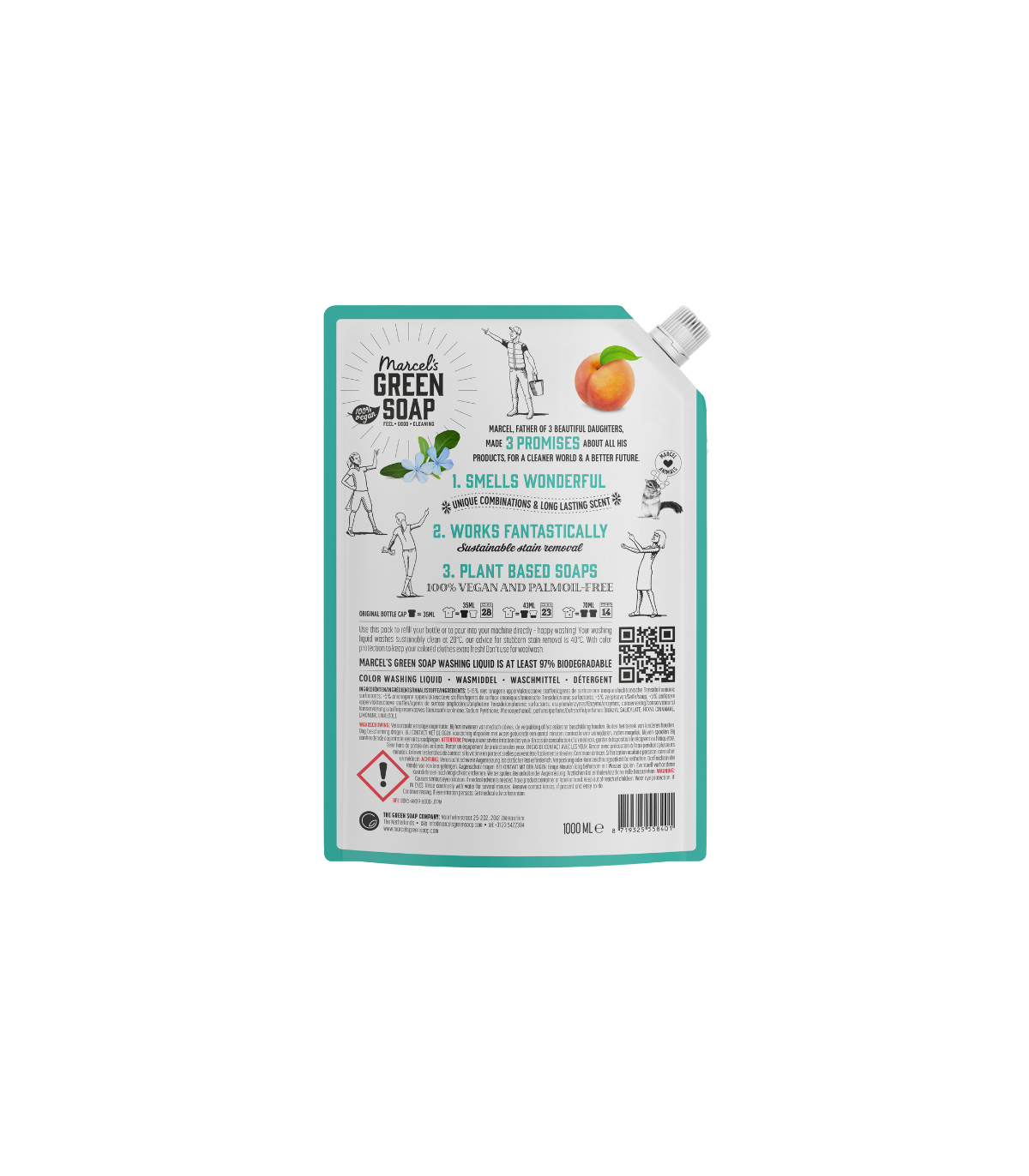 Washing becomes extra sustainable with the Marcel's Green Soap Laundry Detergent Refill Bag Peach & Jasmine .