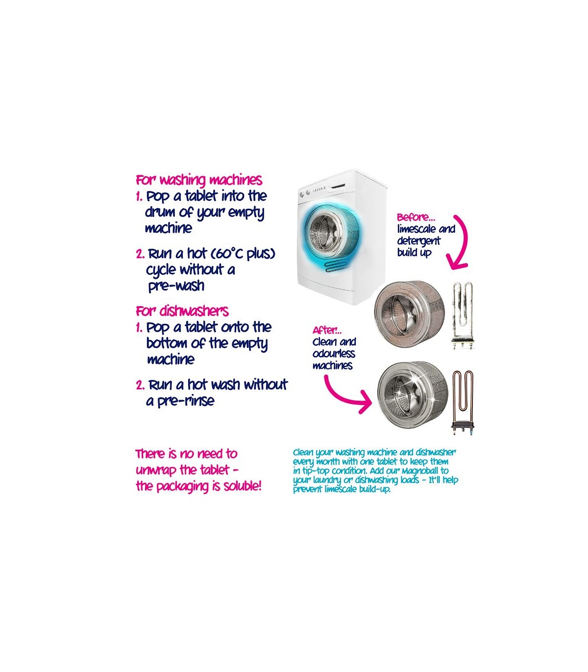 For washing machines: 1) Add a tablet to the drum of your empty machine. 2) Run a hot (60°C or higher) cycle without a prewash.