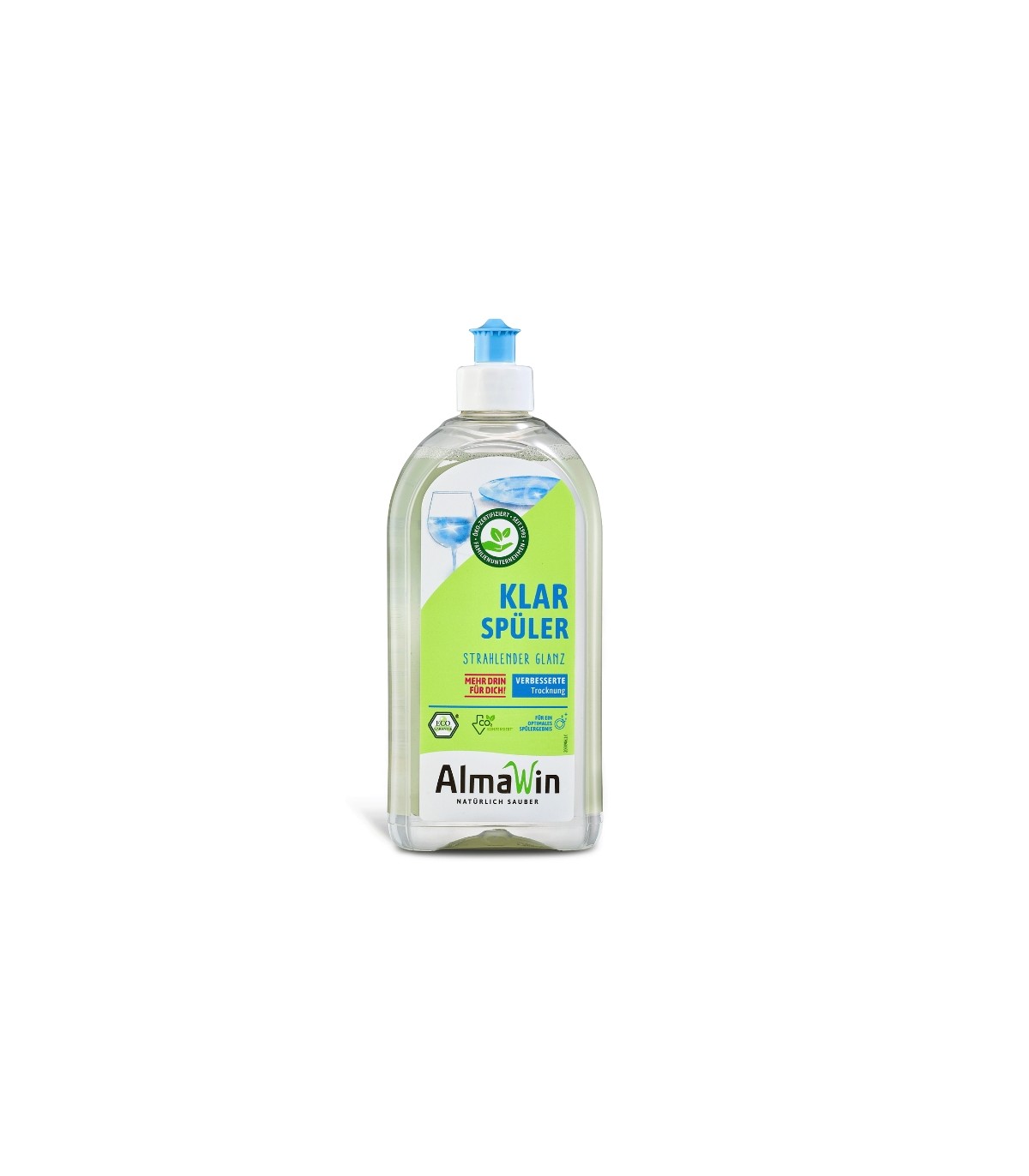 Eco-friendly dishwashing rinse aid without unnecessary chemicals. For sparkling, grease- and stain-free dishes. AlmaWin dishwashing rinse aid is 100% natural, vegan, dermatologically tested, and fragrance-free. Made with skin-friendly, plant-based ingredients. Good for the environment and harmless for you and your family!