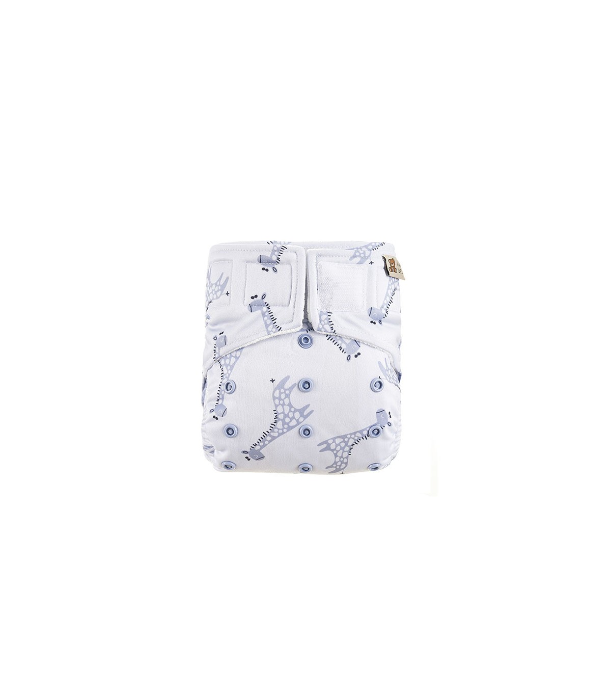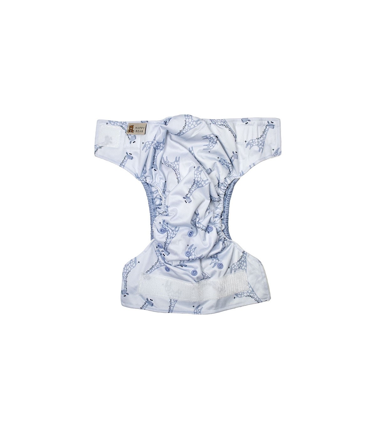 Cloth diapers are back. This light blue HappyBear All-in-One diaper with a giraffe print is just as easy to use as a disposable. The hook-and-loop closure makes changing a breeze! The snaps on the front adjust the diaper's size, making it suitable for use from birth to potty training. It's so convenient and easy on your wallet, too.