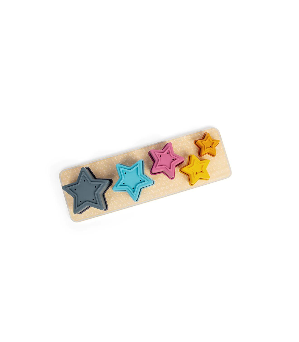 Dit vormsorteerspeelgoed bestaat uit vijf siliconen sterren en een houten sorteerbord. Kinderen leren grootte en kleur herkennen als ze de sterren in de juiste vakjes op het sorteerbord plaatsen. De sterren kunnen ook gebruikt worden als stapelspeelgoed en je kunt ze meenemen in bad.