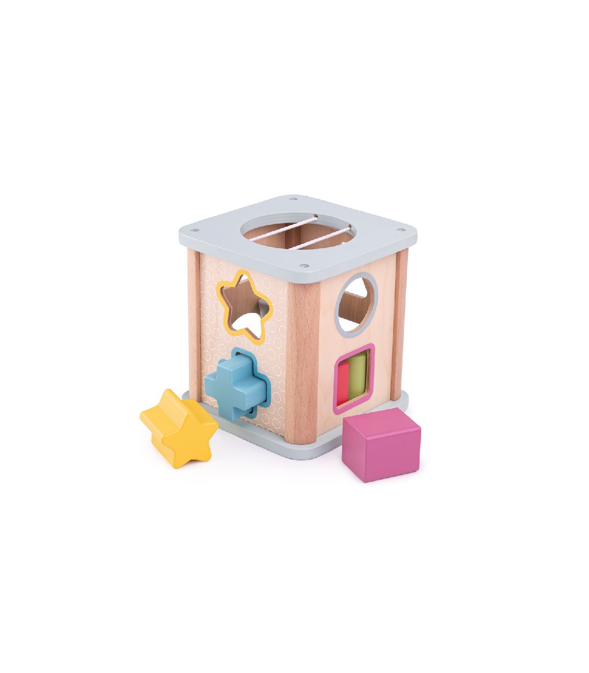 Houten vormensorteerder met gekleurde blokken. Door de blokken door het juiste gat te stoppen maakt je kind kennis met verschillende kleuren en vormen. Dit klassieke spel voor peuters helpt met het ontwikkelen van behendigheid en coördinatie. Bovenin de box zit een gat waardoor de vormen er weer makkelijk uit te pakken zijn.