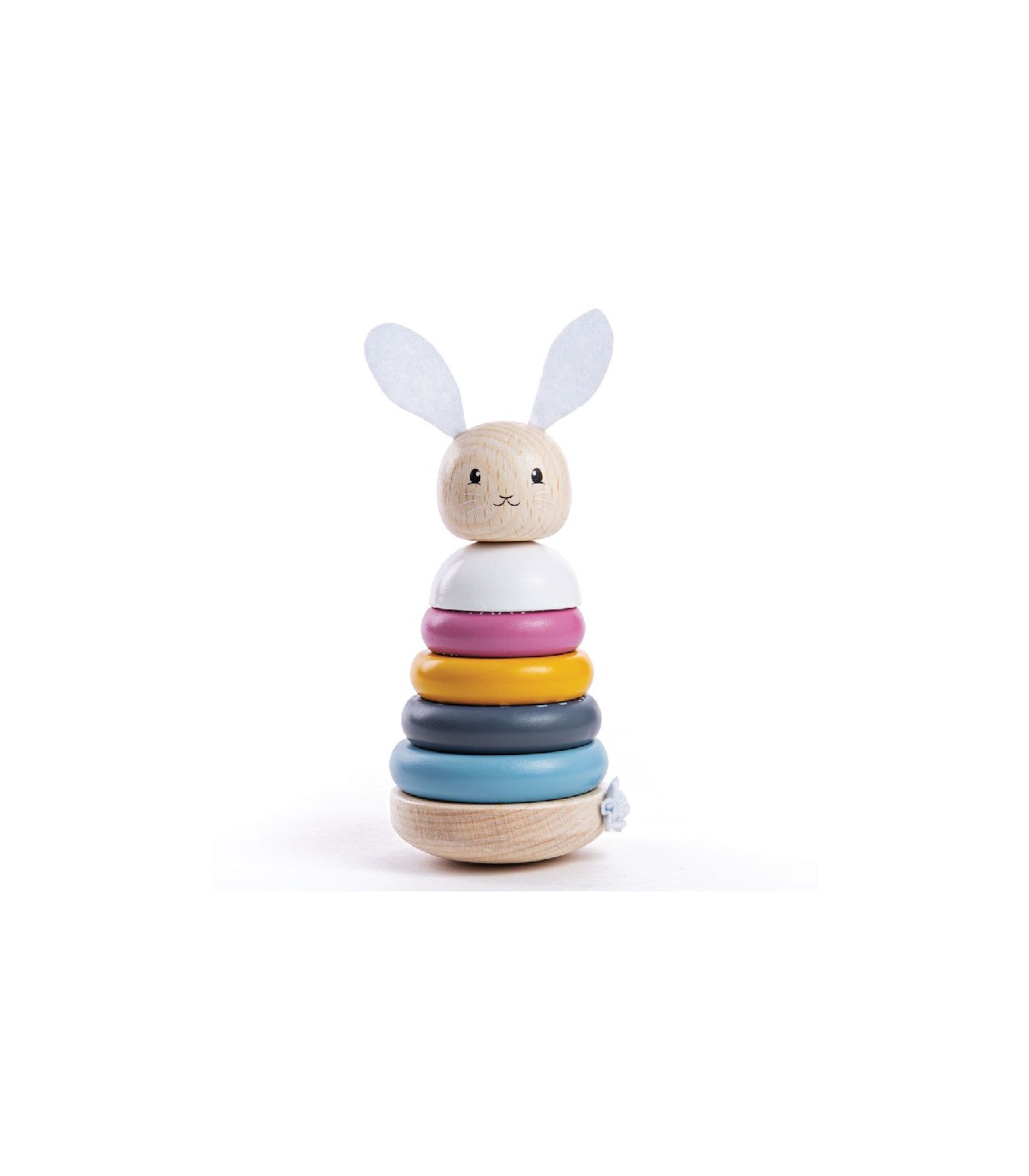 De houten stapeltoren is afgewerkt in heldere kleuren, het konijn heeft vilten oren en een staartje. Hierdoor leren kleine kinderen verschillende structuren herkennen en maken ze kennis met verschillende vormen. Het stapelen van de verschillende delen stimuleert de behendigheid en de feine motoriek.
