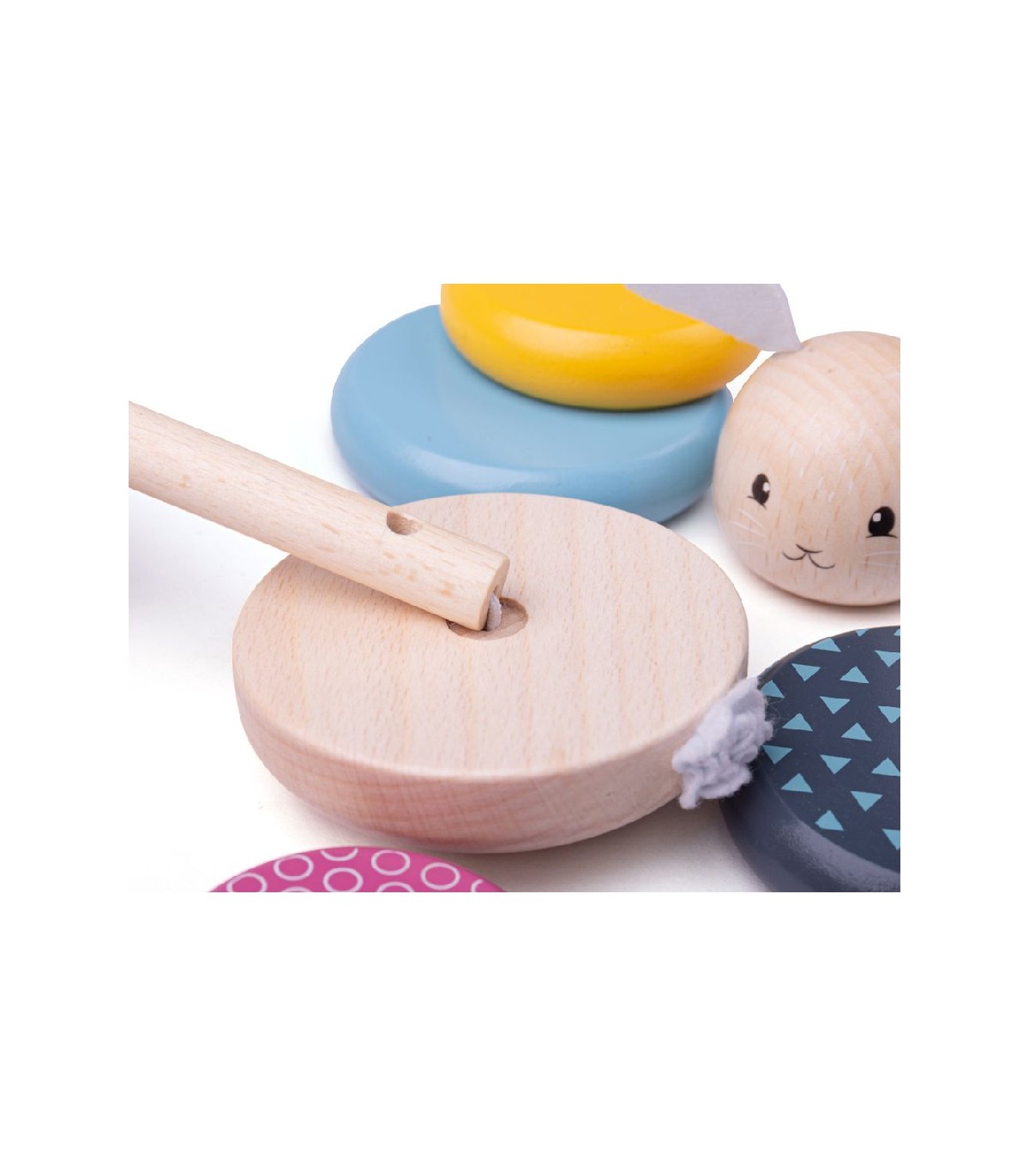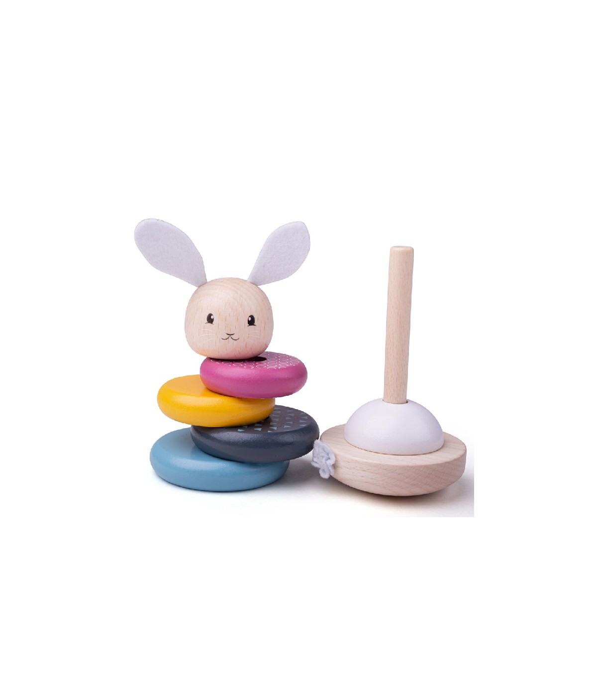 Houten stapeltoren met de vorm van een konijn. De ringen en het hoofdje van het konijn kunnen van groot naar klein op elkaar gestapeld worden. Doordat het stokje in het midden van de toren kan buigen is het makkelijk voor kleine kinderen om de vormen op elkaar te stapelen.