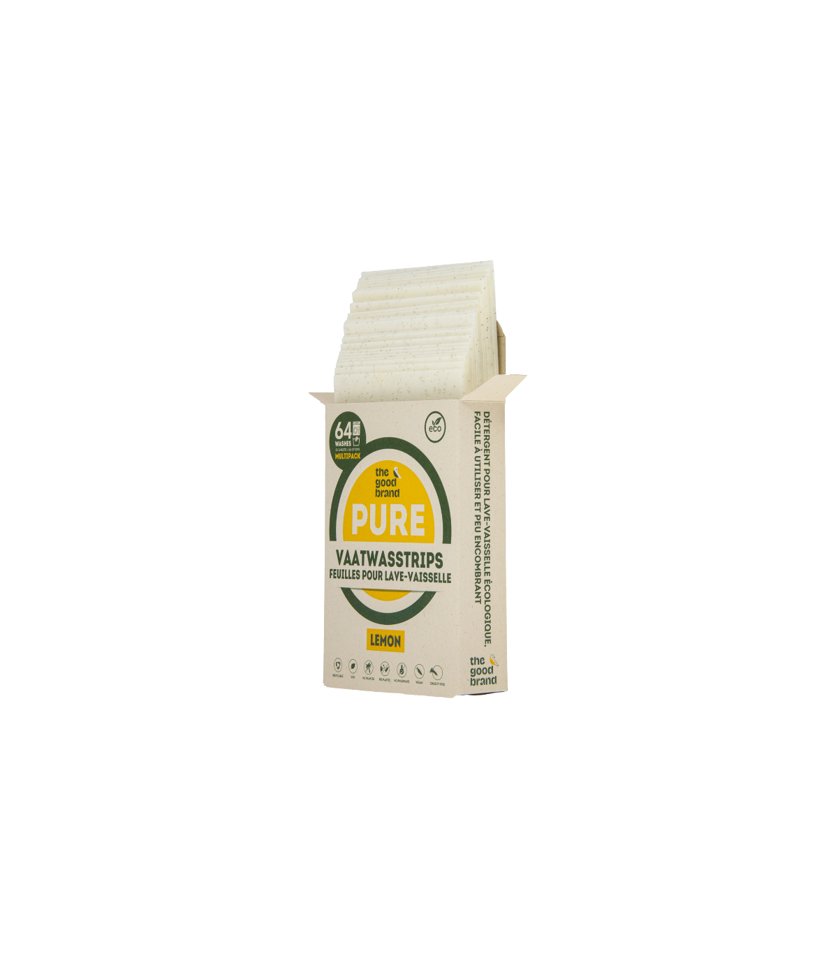 The Good Brand Pure Vaatwasstrips Lemon zijn milieuvriendelijke vaatwastabletten in de vorm van handige strips. Deze biologisch afbreekbare vaatwasstrips lossen volledig op in water en bevatten krachtige enzymen die zorgen voor een stralend schone vaat. De citroengeur zorgt voor een frisse ervaring, terwijl de strips 100% (micro)plasticvrij en zero-waste zijn. Perfect voor wie bewust wil kiezen voor een duurzaam huishouden.