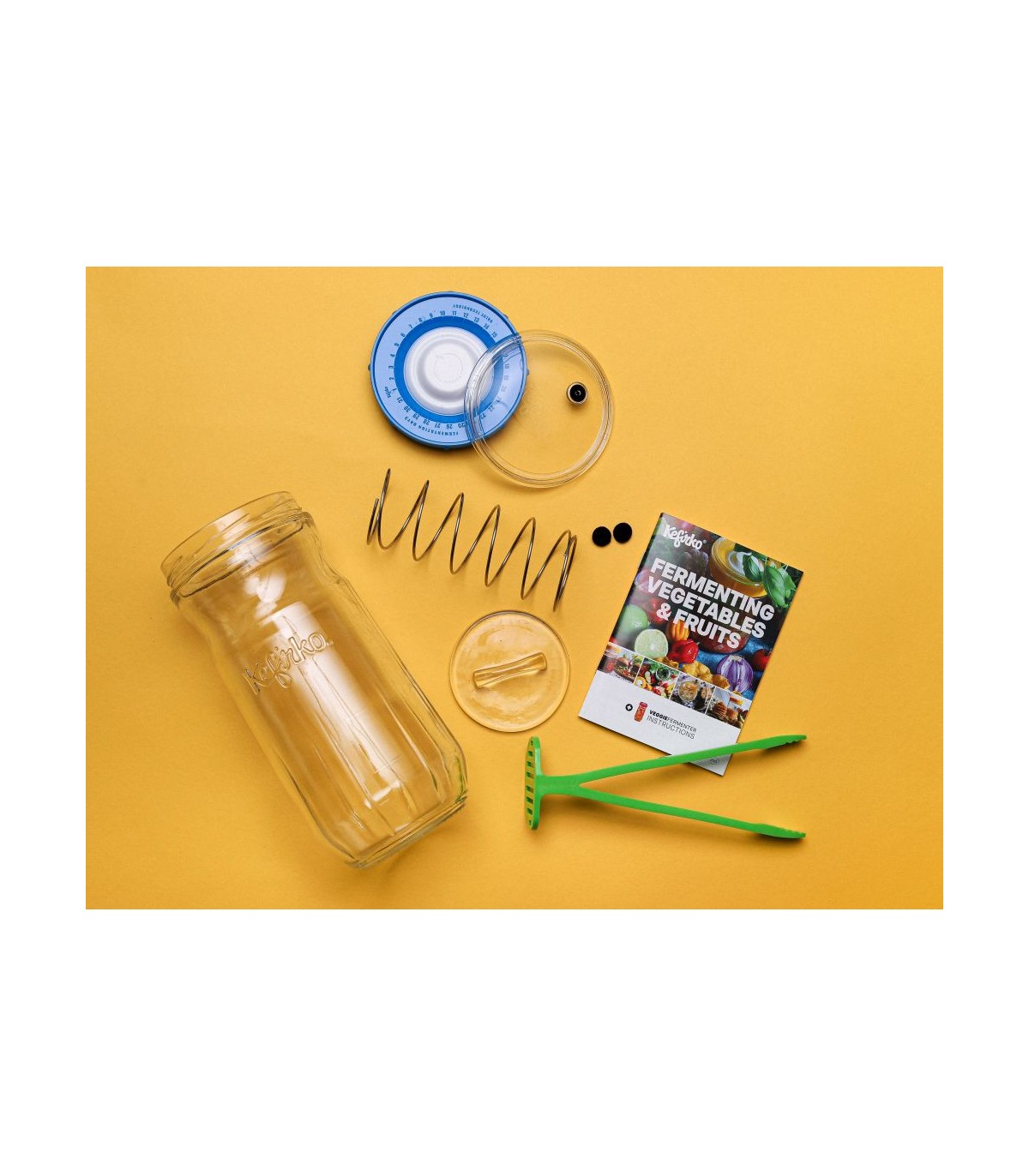 De Kefirko Veggie Fermenter 900 ml is een complete set om groente veilig en eenvoudig te fermenteren. Dankzij het slimme ventilatiesysteem, de persveer en het glasgewicht blijft je groente onder de pekel en kan zuurstof niet naar binnen. Zo maak je zonder gedoe zelf zuurkool, kimchi, knoflook, wortels of ingemaakte groentes.