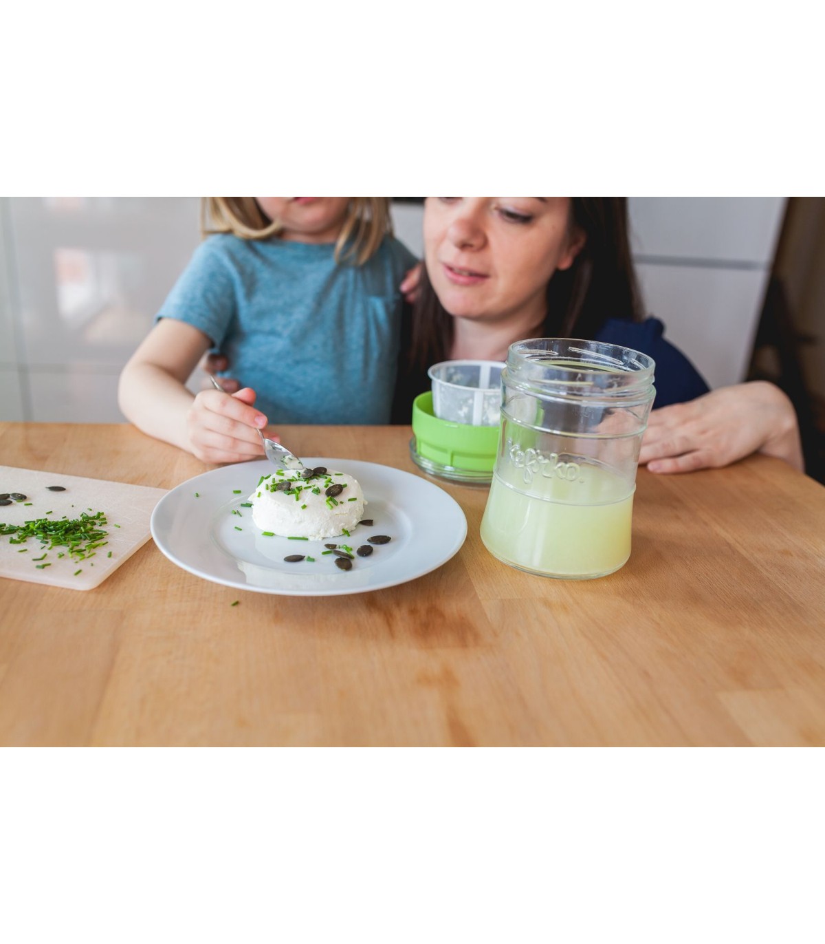Zelf kefirkaas maken met de Kefirko Cheese Maker 1400 ml. Voor romige, probiotische kefirkaas, kwark, ricotta en meer. Inclusief gaasmandje, glazen pot, ring, deksel en persveer.