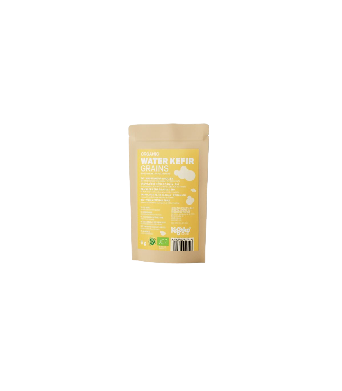 Deze Kefirko Starter Waterkefirkorrels (5 g) bevat levende, herbruikbare culturen waarmee je zelf waterkefir maakt in ongeveer 48 uur.