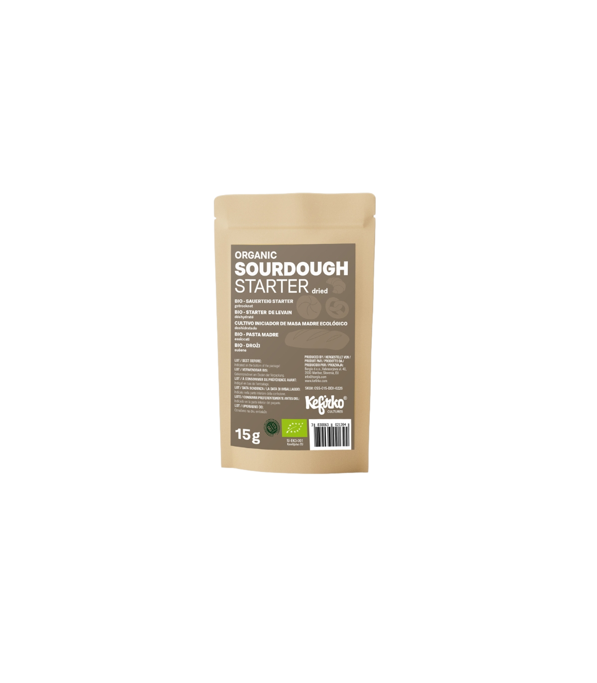 Biologische gedroogde zuurdesemstarter van Kefirko. Beginnersvriendelijk, stabiel en veilig. Activeer met water en bak direct authentiek zuurdesembrood met diepe smaak en levendige fermentatie.