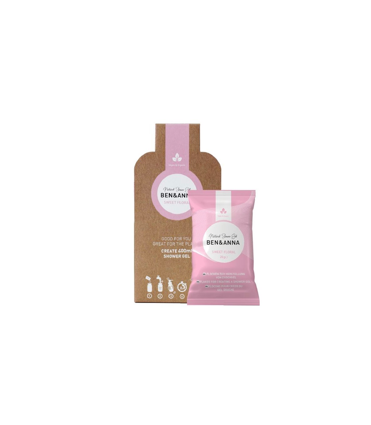 Met deze veganistische & duurzaam verpakte Ben & Anna douchegelvlokken maak je eenvoudig je eigen douchegel. De 2x20g douchegel zakjes zijn voldoende voor 400ml douchegel. Vier verschillende geuren doen je zintuigen herleven: Fruit Fusion, Blue Basil, Mint & Lemon & Sweet Floral. Er is gegarandeerd iets voor iedereen.